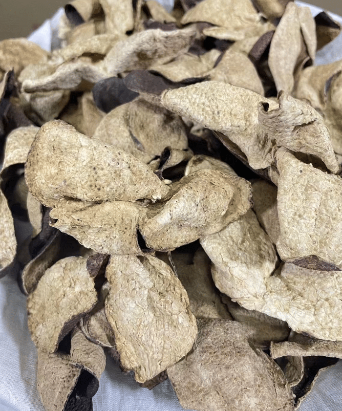 新会陈皮:三瓣状,片张反卷,表皮有密密麻麻、细小凹入的油室,与周围上凸的纹路组合在一起,形成了特有的猪鬃纹路;内囊随年份增加,逐渐风化自然剥落,表皮猪鬃纹呈棕褐色或更深,但无论多陈,都纹理清楚,有光泽。